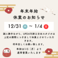 本年は格別のご高配を賜り、心より御礼申し上げます。 年末年始の休業日につきまして、下記のとおりお知らせいたします。 2024年12月31日(火)~2025年1月3日(金) 新年は1月4日(土)より通常通り営業いたします。 休業期間中にいただきましたお問い合わせなどのご連絡につきましては、 1月4日(土)より順次担当者からご返信させていただきます。 期間中は何かとご不便をおかけいたしますが、何卒ご理解いただきますようお願い申し上げます。 引き続き、より一層皆様のご期待にお応えできるよう職員一同努力してまいります。 どうぞよいお年をお迎えください。 来年もどうぞよろしくお願い申し上げます。