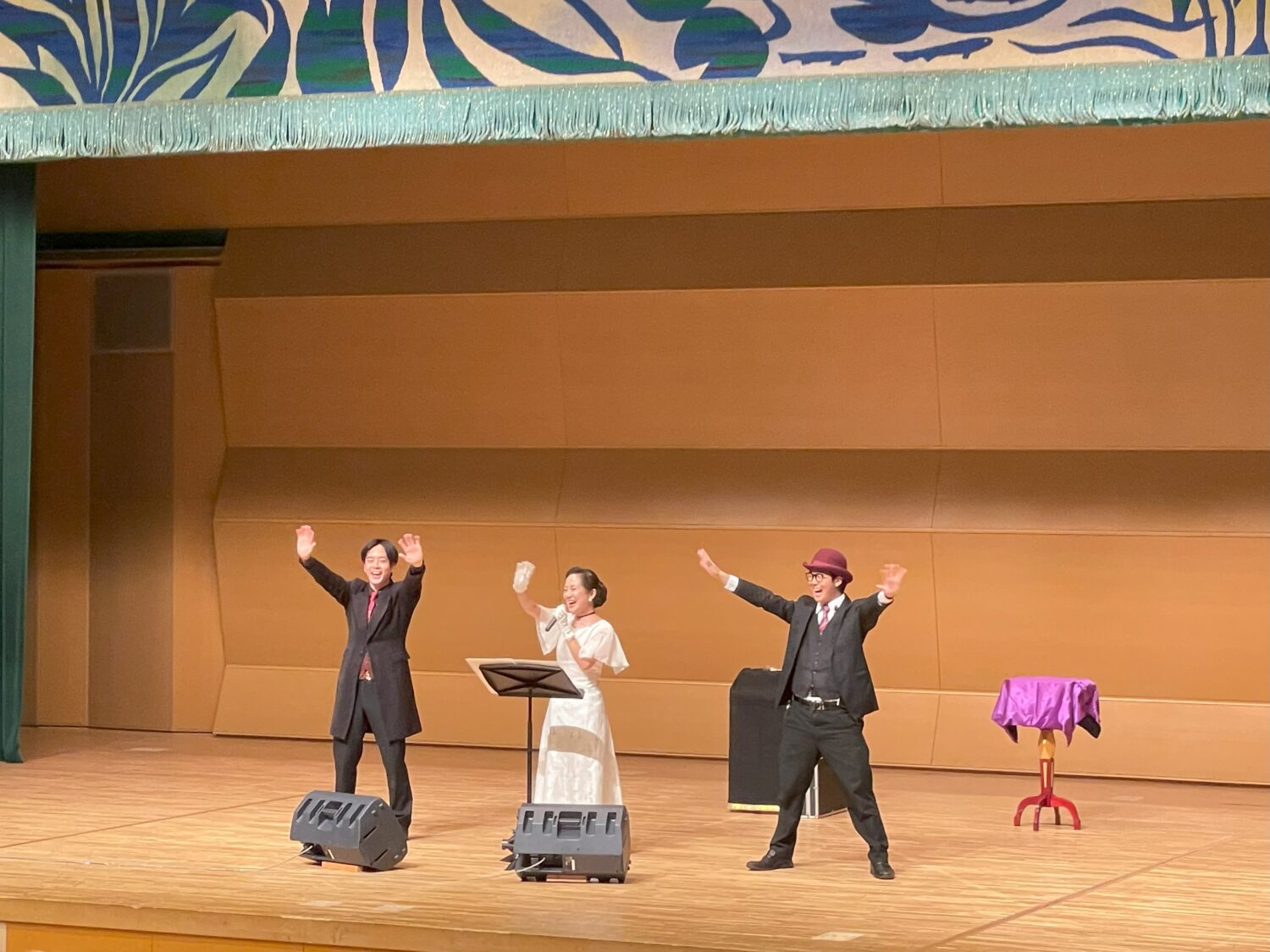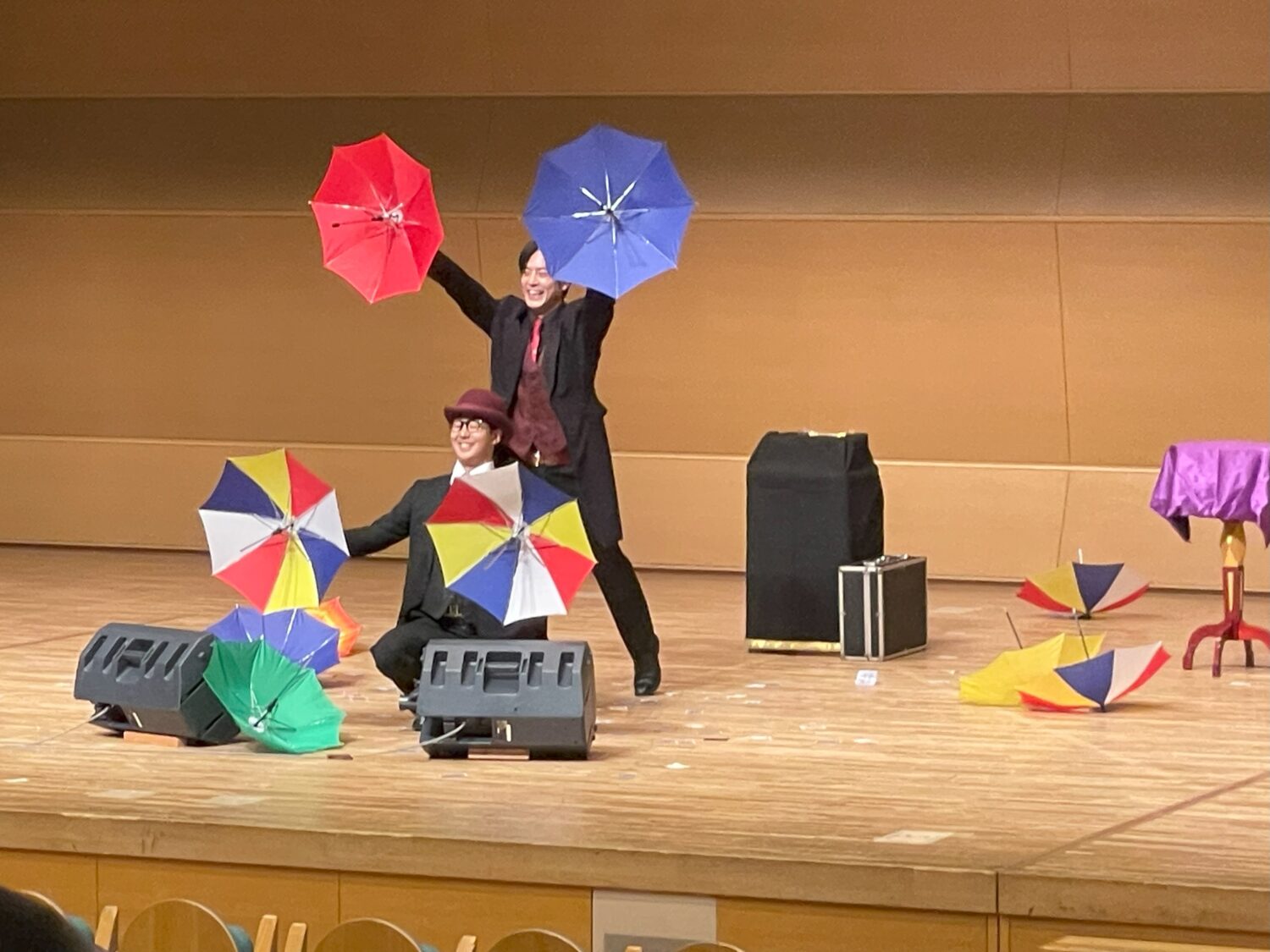 アシスタント役を呼びかけられた際には多くの子どもたちが手を挙げて大きな声で立候補してくれました。選ばれた子は「まんざらでもねぇ」のお二人の指示を聞きながら、アシスタントを行い、成功した際にはとてもうれしそうでした。