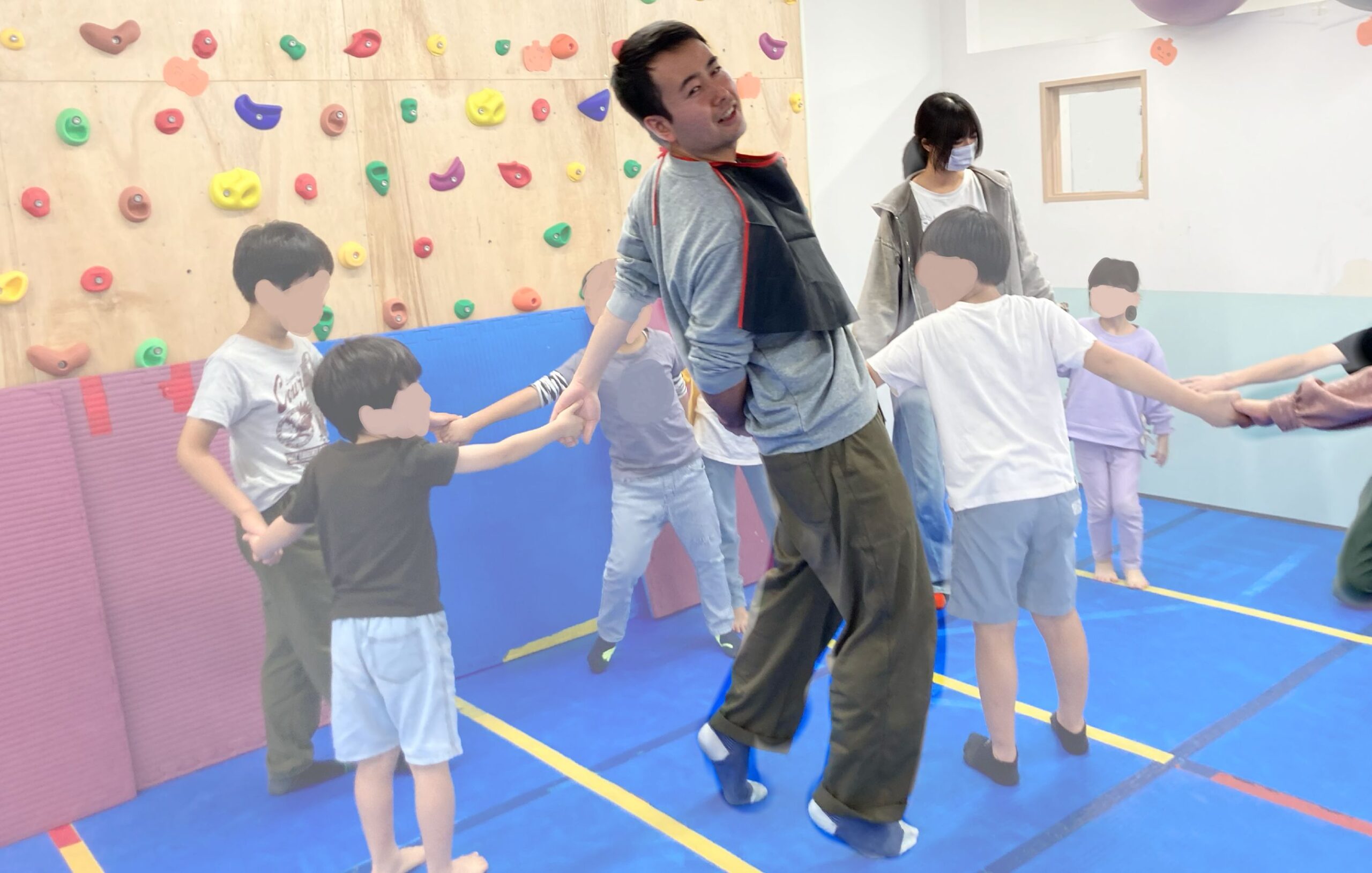 子どもも大人も一つの大きな輪っかになってつないだ手のトンネルをくぐったり、先生の手を踏まないようにまたいだり、手と手が離れないようにみんなでペースを合わせながら動くことができました。
