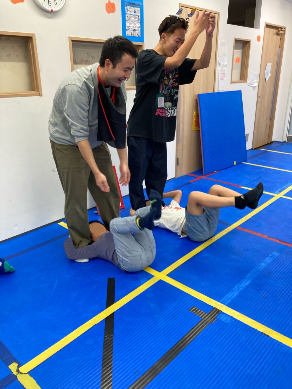 体が硬い大人の先生に子どもたちが柔軟に合わせてくれる様子もありました。